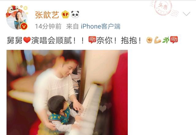 11月15日,张歆艺分享了儿子的近照,并且用小朋友的口吻说道:舅舅演唱会顺逆!奈你!抱抱!