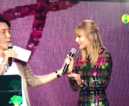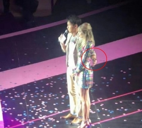泰勒于11日晚间在广州举办见面会,活动现场邀请到男星陈正飞担任主持人,殊不知却纷纷有粉丝发文指责,称陈正飞英文水平差,没办法好好与她沟通,主持得也不好,使得场面几度尴尬,甚至还一直与她有肢体接触,行为引起不少人骂“没有礼貌”,然而另一方面也有人贴出另一个角度的照片,表示陈正飞并没有碰到她,还贴出了照片证明。