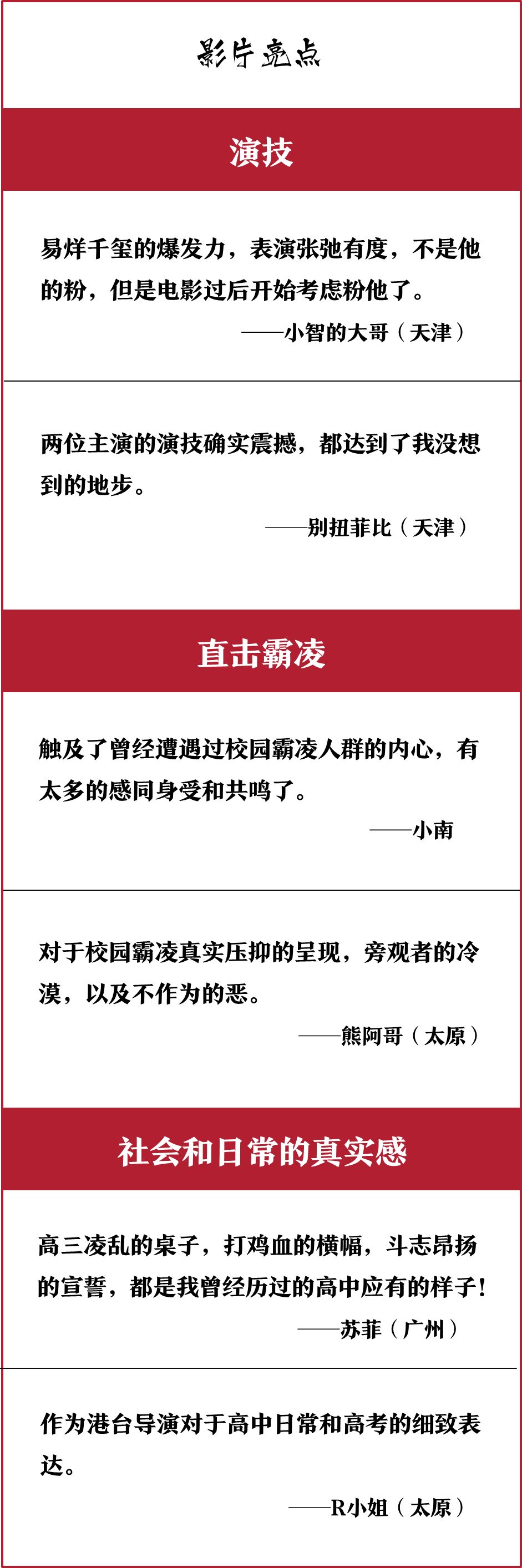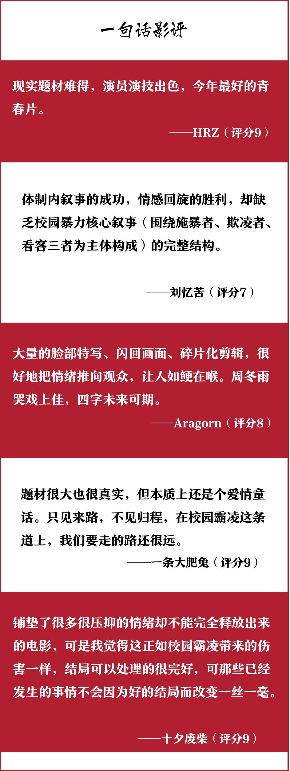 不过,也基于此,我身边有不少朋友有着另一种争议。这部电影对于校园霸凌的展现,到底有没有深入内核?它只是展现了这件事情,还是它真的表现出了这件事情的真实核心?