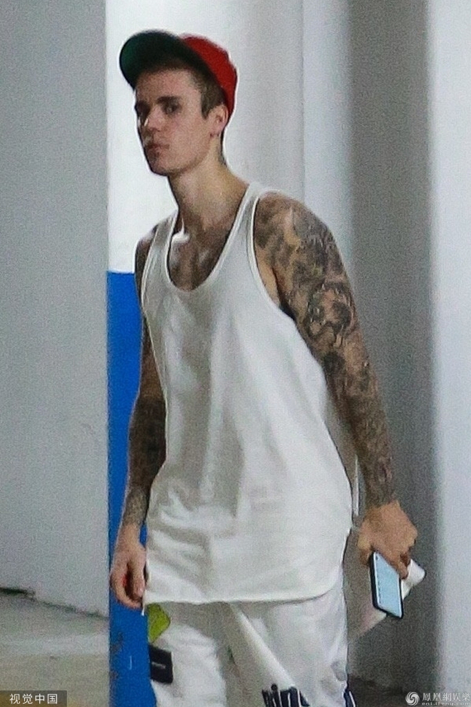 比伯穿白色套装踩粉鞋少年感十足。(图片来源:视觉中国)