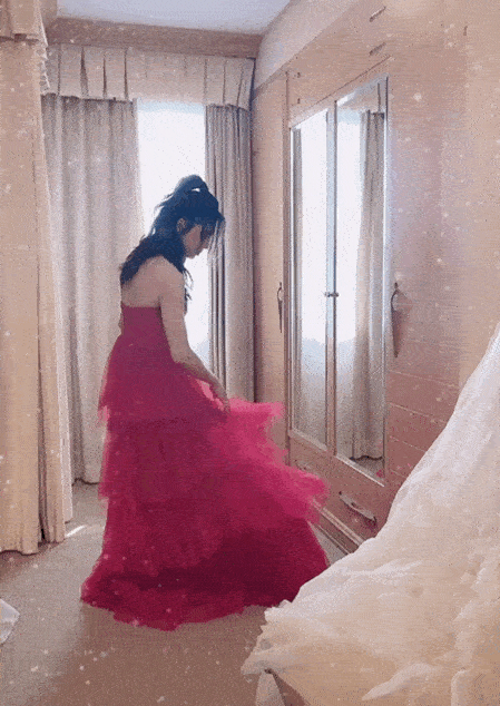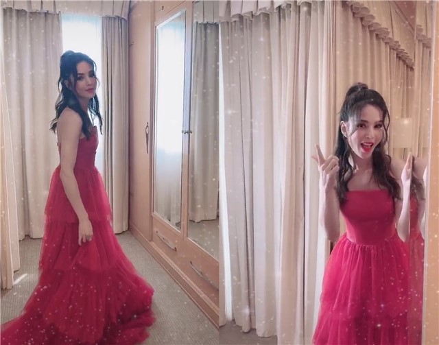 年过四十的李若彤的依旧有一颗少女心啊,看到镜子中一袭红纱的自己,大摆pose,开心的自我欣赏,还送上了手指绯闻,姿态十分年轻。
