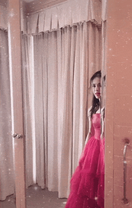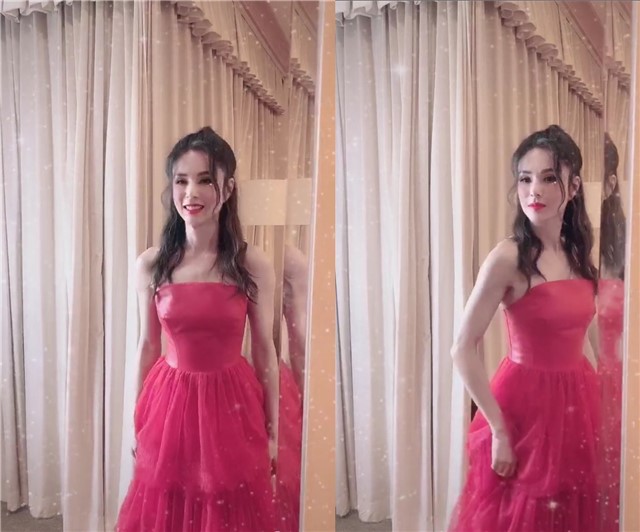 李若彤站在镜子前,自己整理华丽的裙摆,看到有人在录像,立马“女神范”上身,对着镜头微微一笑,便转向镜子欣赏美美的自己。