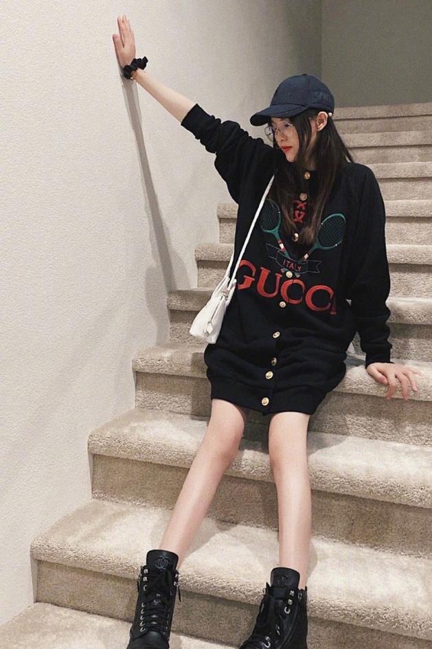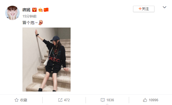 10月30日,唐嫣晒出一张近照,并俏皮配文:“冒个泡~”照片中,唐嫣端坐在台阶上,戴着鸭舌帽配金属质感眼镜框,黑色长款针织毛衣大秀美腿,怀孕数月仍不显孕肚。