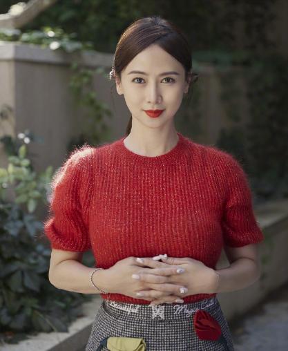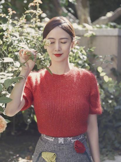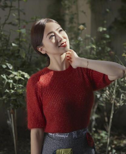 镜头下,沐浴在金色阳光下的翁虹长发束起,肤白貌美,红唇夺目,配上身旁茂密的绿植,当真是“万绿丛中一点红”。