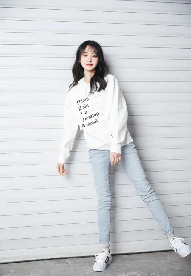 郑爽身穿纯白色卫衣和浅蓝色牛仔裤清爽出镜,干净利落。