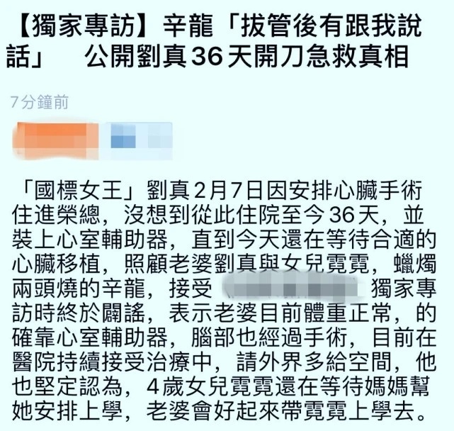 2月7日,刘真到台北荣总医院进行手术,但术后心脏功能不佳需要接上叶克膜帮助。