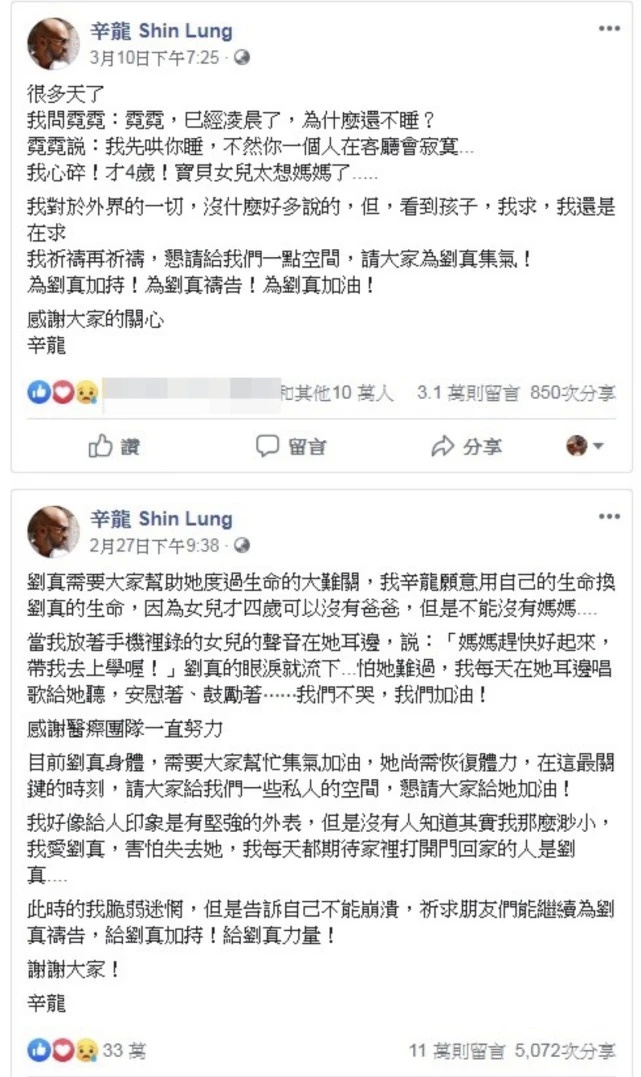 刘真丈夫辛龙虽然不愿多谈她的病情,但担忧爱妻的他曾两度在社交网发声,为刘真集气。