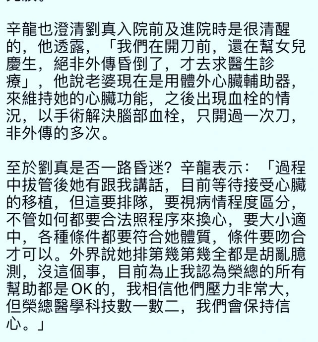 目前,刘真在排队等待心脏移植,不过辛龙表示外界所报道的排队顺序全是胡乱猜测,因为“换心”情况很复杂,要依据病情、匹配度等种种条件,每样都要吻合才能做手术。