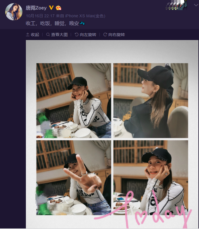 昨晚,曹云金前妻唐菀在微博上晒出美照,并表示:“收工,吃饭,睡觉,晚安”,看来她已经完全走出离婚的伤痛,近段时间状态大好,心情也非常不错