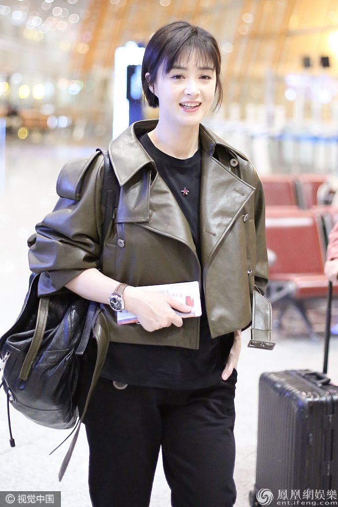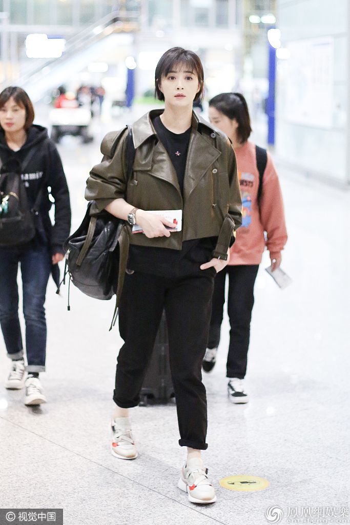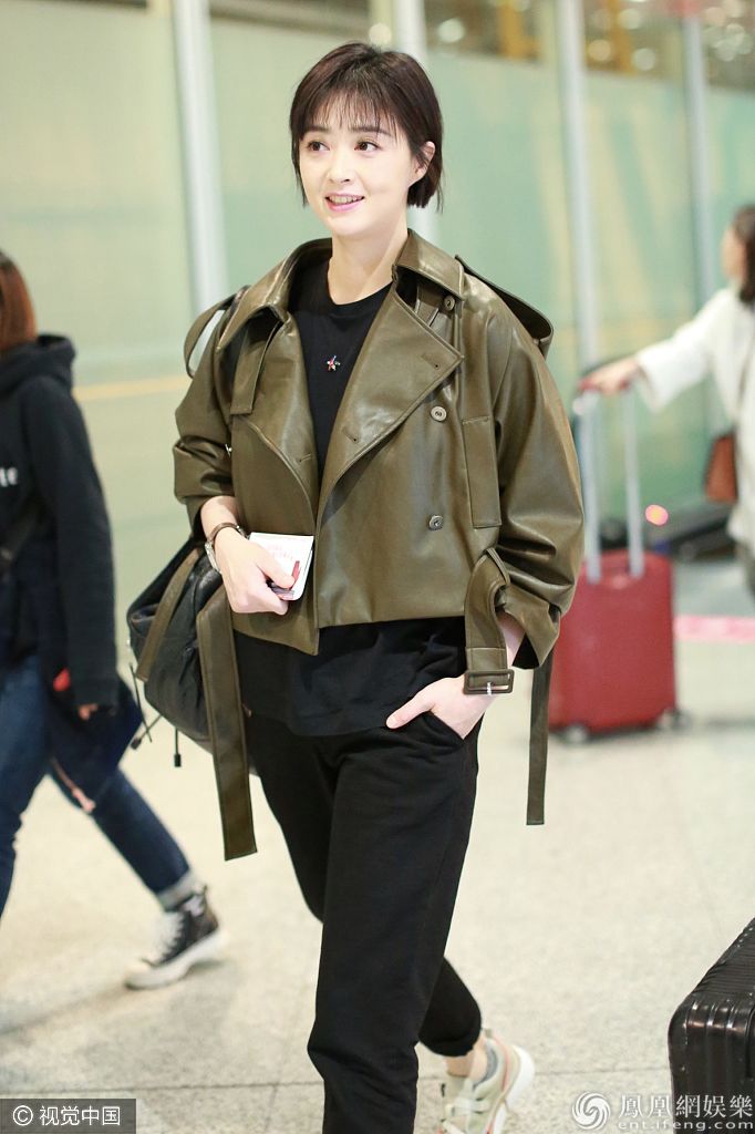 蒋欣梳干练短发穿墨绿夹克大走中性风,美又飒。 图片来源:ALO/视觉中国