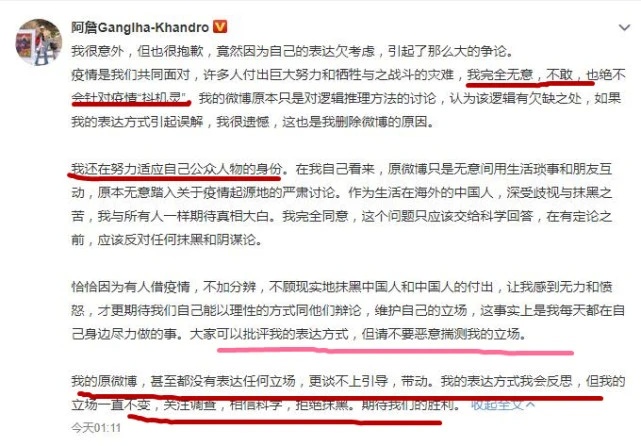 在网友们铺天盖地的舆论攻势詹青云最终还是道歉了,给出的理由是自己绝对没有面对疫情抖机灵,而且她还在努力适应自己公众人物的身份。