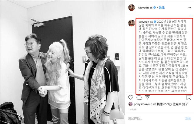 泰妍接着写到:“对于我以及我的家人来说,3月9日真的会是难以忘记的一天。爸爸从我小时候开始学音乐的第一天开始就陪着我一起,会先出门发动汽车,然后为了女儿来回奔忙。现在也会在某个地方为了大家而先过去。相信爸爸会在很好的地方安顿,守护我们。最后,要感谢所有关心我,为了我而努力的所有人。”