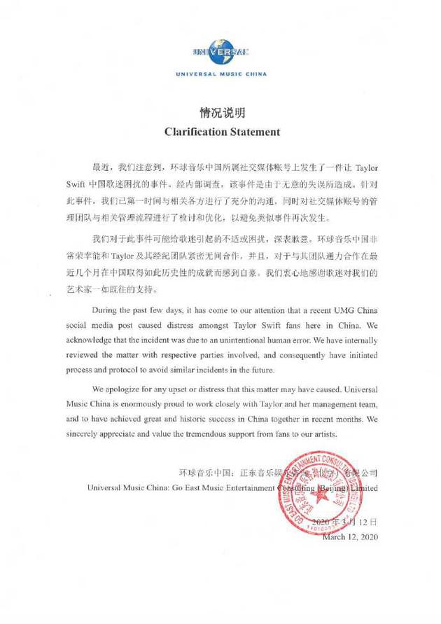 3月12日,环球音乐国际部发布情况说明书,回应此前点赞侮辱霉霉(Taylor Swift)的评论一事,称经过内部调查,该事件是由于无意的失误所造成。针对此事已第一时间与相关各方进行了充分的沟通,同时也对社交媒体账号的管理团队与相关管理流程进行了检讨和优化,以避免此类事情再发生。