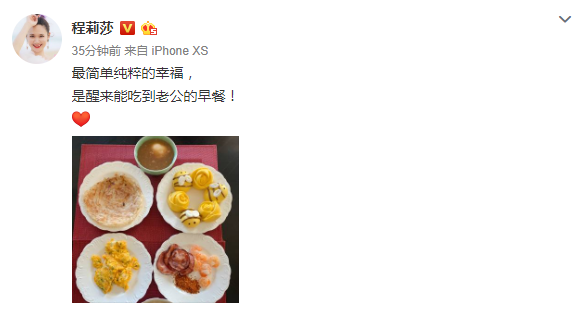 3月12日,程莉莎分享一张早餐照,并配文:“最简单纯粹的幸福,是醒来能吃到老公的早餐!” 照片中郭晓东为爱妻准备了丰盛的早餐,从粥、炒蛋到手抓饼,色香味俱全,尽显恩爱甜蜜。