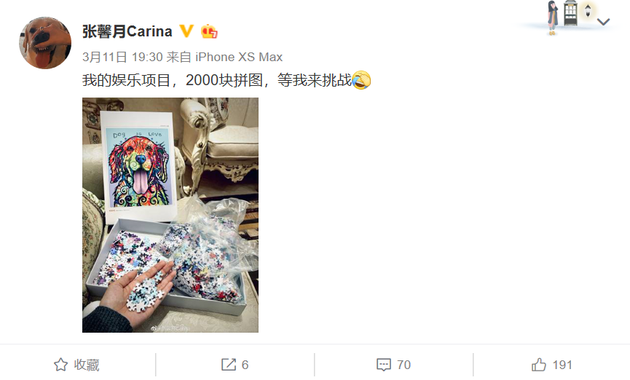 据香港媒体报道,近日,宅在家中抗疫的张馨月,在社交网上透露要挑战自己,拼2000块拼图:“我的娱乐项目,2000块拼图,等我来挑战。”