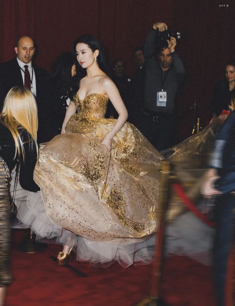 海报架上,红毯铺好,闪光灯准备好,刘亦菲就在这种万众瞩目的期待中出场了。她身上穿着Elie Saab 2019秋冬高级定制金色凤凰裙,戴着两百万的Chaumet天穹皓境耳环,奢华到令人睁不开眼睛。