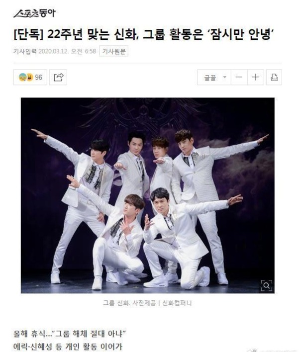 3月12日,据韩媒,歌谣界方面透露,将在3月24日迎来出道22周年的神话组合决定暂时休息,不进行组合活动。