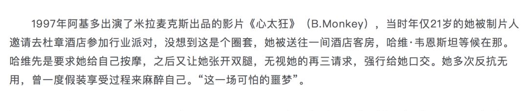 在对韦恩斯坦进行了实名指控之后,艾莎·阿基多还与萨尔玛·海耶克等人联手,和BBC进行合作拍摄纪录片,进一步揭露韦恩斯坦的邪恶罪行。