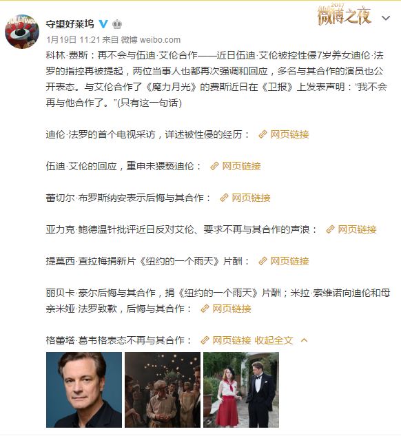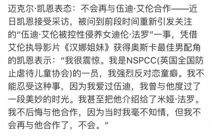 之前与伍迪·艾伦合作过的科林·费斯、玛丽昂·歌利亚、蕾切尔·布罗斯纳安、丽贝卡·豪尔、亚力克·鲍德温......都明确表示后悔曾经合作,未来将不再合作!!!