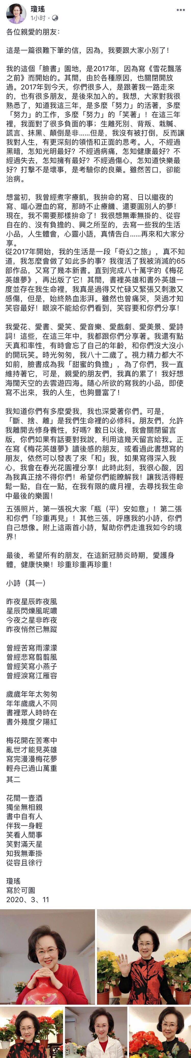 琼瑶在文末表示,几日后将正式关闭留言区,并送上五张近照和两首小诗,送给喜欢她的朋友们。