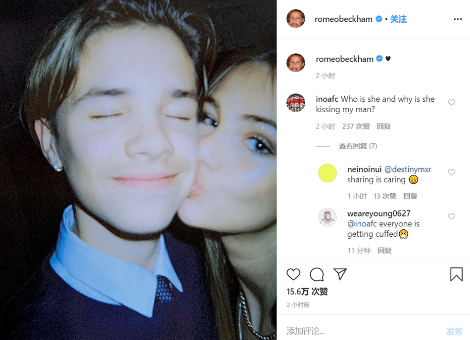 "近日,贝克汉姆二儿子罗密欧在社交账号与女友mia同发甜蜜亲脸"二人还配上爱心表情,狂撒狗粮。"据悉,二人经常在社交平台亲密互动并多次晒合照。"罗密欧与女友。340微信扫一扫复制下方链接,去粘贴给好友吧-贝克汉姆二儿子与女友同发亲脸照 甜蜜撒狗粮复制链接本文由网络整理 © 版权归原作者所有