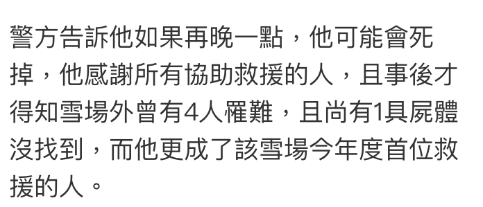 据悉,当天张佑天在和友人一同滑完雪之后,兴致未减,脱下发热衣后,自己又单独滑了一会儿。张佑天有着近5年的滑雪经验,因而丝毫不在意,直到离滑雪场越来越远,往回滑了三个小时都没有回到滑雪场。
