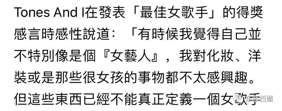 在2019年澳洲音乐大奖上,一举拿走4项大奖、成为当晚最大赢家的toni发表获奖感言时说:“有时候我觉得自己特别不像女艺人,我对化妆、洋装或是那些很女性的事物都不太感兴趣,但这些东西已经不能真正定义一个女歌手了。”