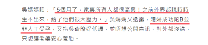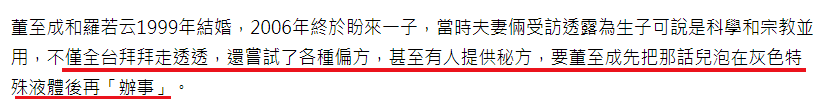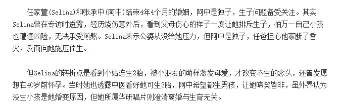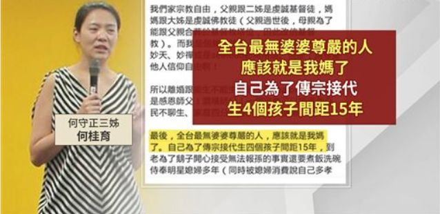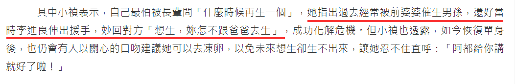 老公、婆婆、爸爸都着急“继后香灯”,女明星压力好大 演艺圈里,陷入“求子”焦虑的女明星不少。 据说刘诗诗和吴奇隆结婚时,吴妈妈就说:“希望他们赶紧生小孩”。 后来刘诗诗怀孕,吴奇隆妈妈又放话,说之前外界都说诗诗生不出来,给了他们很大的压力,还特别强调:刘诗诗并非人工受孕,是自然怀上的。 虽然诗隆结婚几年来都说不着急要孩子,但两人被网友拍到同游清水寺,去的还是祈求安产的“子安塔”,也难怪,婆婆三番五次这么昭告媒体,两个人的生育压力还是挺大的。 还有Selina,和张承中结婚后不久,小夫妻一起上节目做汤圆,任爸和阿中给她的祝福是:“吃甜甜,明年生厚生(闽南语‘儿子’)。” 对此Selina表示疑惑,直问:“重男轻女吗?其实我觉得女生也很好。” 即便Selina这么说,阿中和任爸还是表示想要男孩。 但有烧伤阴影的Selina,很害怕小孩长大后会遇到意外,多次透露“不想生”。最终两人离婚,当时外界揣测他们离婚和阿中急于求子有关。 Selina公司还强调两人离婚和生育无关。但其实Selina早就说过,阿中是家中独子,连任爸都会说她不能断了人家的“香火”,无形中给她施加很多压力。 来源:凤凰娱乐 离婚后,张承中和金钟视后尹馨交往,没过多久急要孩子的他又和女友求婚了…… 虽然尹馨没答应,两人的恋情也是建立在结婚生子的共识上进行的 另一位和渣男老公纠葛多年的女星小祯,为前夫李进良生过一个女儿,网传两人在生二胎一事上没有达成共识,因为李进良说拼二胎的话“只能生儿子”。 但到2018年,小祯听灵媒说自己会为李家添一男丁,真的心动了……两人感情回温。 只是考虑到女儿已十岁,生二胎俩孩子会年龄差距太大,她才慢慢断了生娃念头,最后狠下心来和花心老公离婚。 后来她爆料,结婚多年她一直被婆婆催生儿子,还是李进良听到受不了,帮她说话,才算挡回一些压力。 同样执念生男孩的还有欧阳娜娜的妈妈傅娟。 她生完娜娜之后上了一个讲星座风水八卦的节目,节目上有“大师”告诉她,想要生男孩就得改变家里的“领导权”,傅娟听完超相信,一直附和“大师”。 具体是说欧阳龙体质容易生男,她体质易生女,所以想生男孩得看谁的领导权多一点 当时年逾四十的她得过子宫颈癌,可为给欧阳龙生儿子,她不惜再拼三胎,结果生了小女儿。 这个女儿,他们给起名“欧阳娣娣”。 后来傅娟还自爆,她怀孕七次流产4次,虽然现在有三个漂亮的女儿,可她还是遗憾没能为欧阳龙生儿子。 后来,她又把抱孙子的愿望转移到大女儿欧阳妮妮身上,希望她快点交男友结婚。 傅娟名言:“她19岁了怎么还没男友!”…… 更有一些自私的家庭,不仅要求女性“必须生儿子”,而且孩子必须健康周全,否则全部账算到媳妇头上。 高知美女医生黄宥嘉就摊上这样的家庭。 黄医生在节目说,其实夫妻做检查时,已经明确是男方的问题,男方却嘴硬,说是医院想赚钱。 后来试管婴儿终于成功了,儿子却因为早产有先天疾病,食道闭锁。 黄医生的婆婆于是把孩子的问题归咎到她“子宫不好,才会生出这样的小孩”,和丈夫吵架,丈夫还会用尿布扔她脸上。 在一次次家庭冲突中,她终于意识到,自己不过是别人的“生子机器”而已,因此决定离婚。 生吞青蛙、吃蜘蛛、念咒语、取卵针打到病危…有必要吗? 正因为来自亲人或朋友的“世俗压力”,许多艺人为求子开始剑走偏锋,相信偏方甚至迷信稀奇古怪的方法。 比如“老婆爱上女教练的”的董至成,就试过很另类的求子方法…… 台湾职棒明星球员陈致远的妻子林秀琴也算是位“综艺咖”,虽然老公经常被拍到“搂妹回家”,自己也被拍过“嫩弟过夜”。 可是丝毫不影响两人生孩子的热情。 为了求子,林秀琴几乎是无所不用其极,包括配着米酒生吞十八只青蛙,打个嗝都觉得青蛙要跑出来了。 她还爆料,小S为了生儿子也试过生吞壁虎干。 女艺人况明洁则被推荐喝星宿老怪同款“五毒汤”,她记得里面的蜘蛛有手掌那么大,口感还有点像毛蟹…… 偏方不行,就去求助神秘力量,在朋友怂恿下,况明洁去寺庙拜神求回来一朵花,放在卧室“做功课”时看得到的地方…… 也是庹宗康的前女友 女歌手melody则是把“好姐妹儿子的衣服藏在衣柜”,造人之后念上一遍咒语。 陶喆前女友,还记得吗 美女主持高伊玲则差点“引祸上身”。她在土耳其跑外景时,听说当地妈妈很会生,还会制作“求子娃娃”,特意在当地找到一个求子娃娃,还亲手画上眼睛,希望带来好运……回来却被朋友提醒:小心招来不干净的东西。 就这样把自己吓得半死,当然最终只是虚惊一场。 虽然听起来像天方夜谭,但医生说了:这种心理疗效还是挺好的。 台湾试管生殖技术成熟,人工受孕和试管婴儿也是许多不孕夫妻的选择。 但也因为技术成熟、应用普遍,许多女孩会忽略手术带来的痛苦和身体伤害,为了怀孕“拼死一搏”,走上“血淋淋”的求子路。 比如患有严重子宫内膜异位和巧克力囊肿的melody,就因为试管婴儿差点丧命。 她在自己的书《翻滚吧!贵妇》中回忆这段经历,“肚子取到卵后,流血不止,肚子肿得青蛙一样,在家里昏倒,我老公现在回想起来都觉得害怕。” 老公不舍得她受苦,最终在努力四年后放弃求子,小两口还一起出国旅游散心,可能因为放松了心情,他们反而造人成功了,先后生下两个女儿。 虽然过程有凶险,不过相对很多人来说,Melod