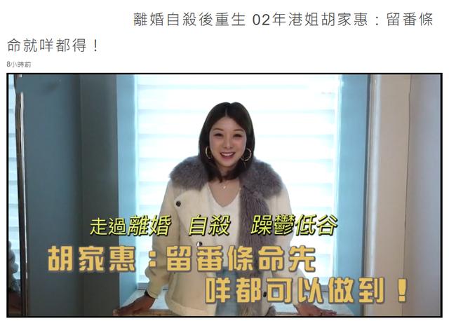 3月11日,据港媒报道,前港姐胡家惠在经历了离婚、抑郁、自杀之后,如今走出低谷,重新出发,近日她接受访问,讲述了自己在遭遇前夫背叛之后的心力路程,深感只要留一条命在,什么都可以做