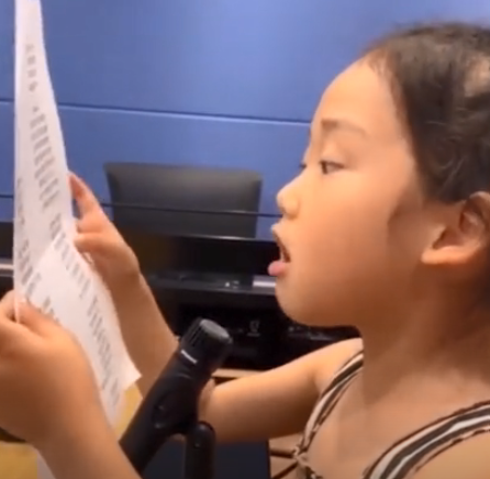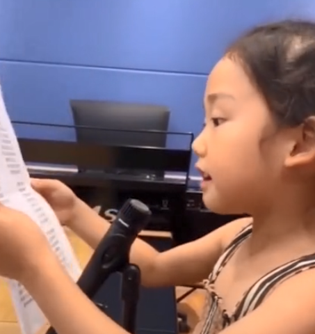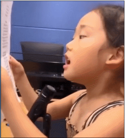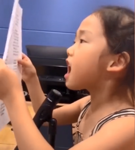 视频中,玲花的小女儿拿着歌词与正在录音的妈妈一起大声唱歌,嗓音嘹亮豪迈,得妈妈真传。