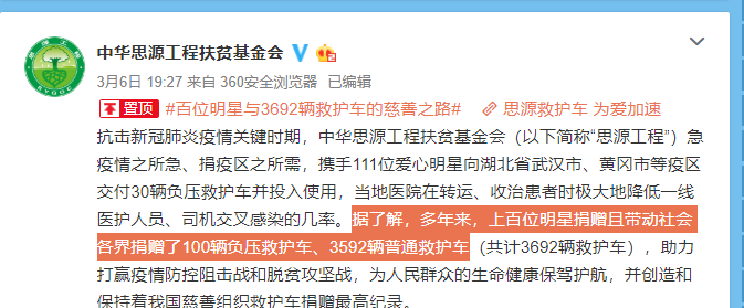 据了解,此次思源工程官博发文也表示此次救护车辆是多年来上百位明星带动社会各界所捐赠的物资,并非此次专款。