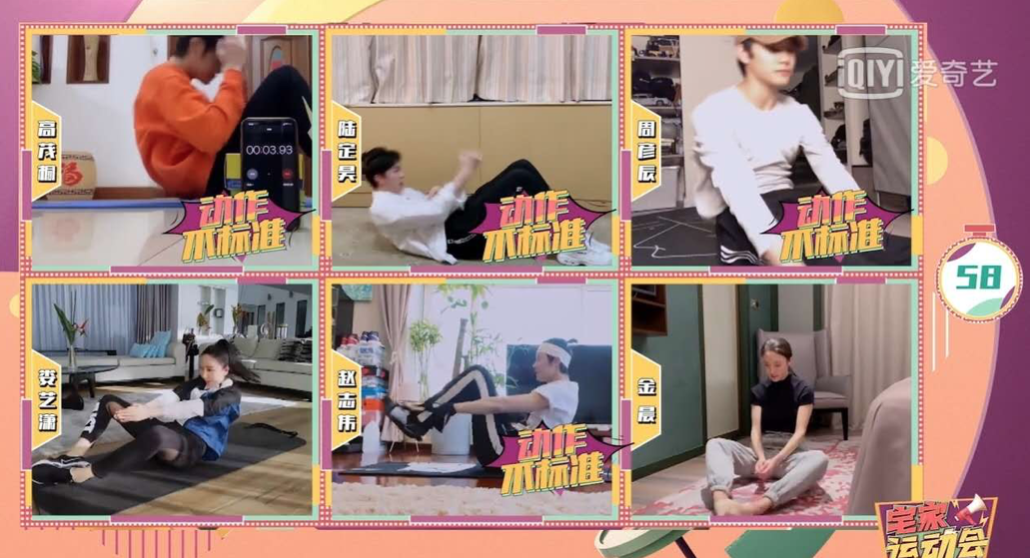 当然,除了陪伴,挖空脑洞的娱乐游戏也是人们一大需求。为了获得发挥更好的效果,《宅家猜猜猜》和《宅家运动会》这种娱乐游戏类节目就参加的艺人都进行了细心分类。比如张云龙、刘芮麟、周彦辰这种健身达人,就参与的是运动会的耐力运动项目,在节目中,人们可以找到这种动作规范、身形健美的健身模范,可以自己在家运动。更用一个全览平视的视角,发现艺人宅家的状态,和自己宅家的状态有更多的共鸣。比如费启鸣夏瀚宇一直没去剪的长刘海,还有他们因为宅家里略有飙升的体重,以及五花八门从屏幕前飘过的居家服。《宅家猜猜猜》则搭配了明星“朋友圈”,满足了大家许久不见的同框系列。让周琦和杨迪,还有嘉羿和李汶翰参与配音游戏,简单的PK游戏,让他们利用彼此的熟悉产生更多的互动,充实了节目的内容。