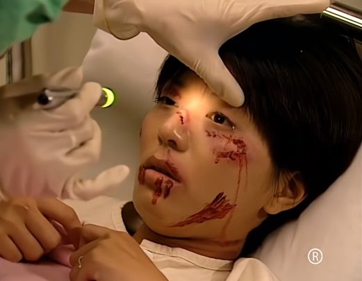 人来人往的收费柜台前,是大量喷射状的血迹。