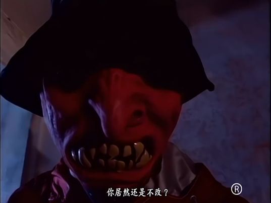 不是人脸,而是戴着黑色渔夫帽、有大齿面具的魔鬼脸。