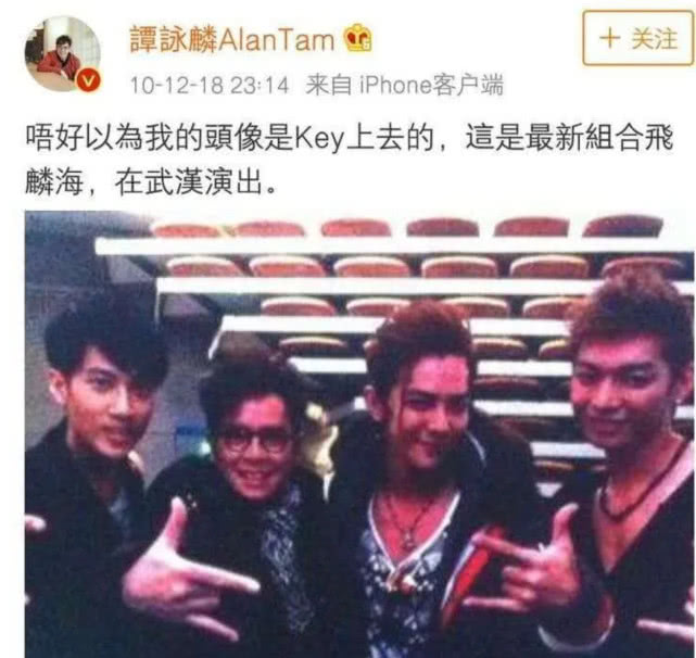 谭咏麟在微博上po出一张唯独没有炎亚纶的合照,开玩笑说新组合飞麟海成立了,炎亚纶对此非常不满,并回复“攀关系我不懂”,吓的谭校长赶紧道歉澄清。