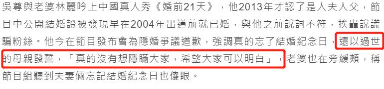 吴尊为记错结婚纪念日道歉,之后又否认了刻意隐瞒已婚事实,他先是拉出节目组,接着更以亡母发誓:“你们可以问节目组的人,我从来没想要隐瞒,我可以对天上的妈妈发誓。”接着又强调说:“真的没有想隐瞒大家,希望大家可以明白。”老婆林丽吟也在一旁频频点头。