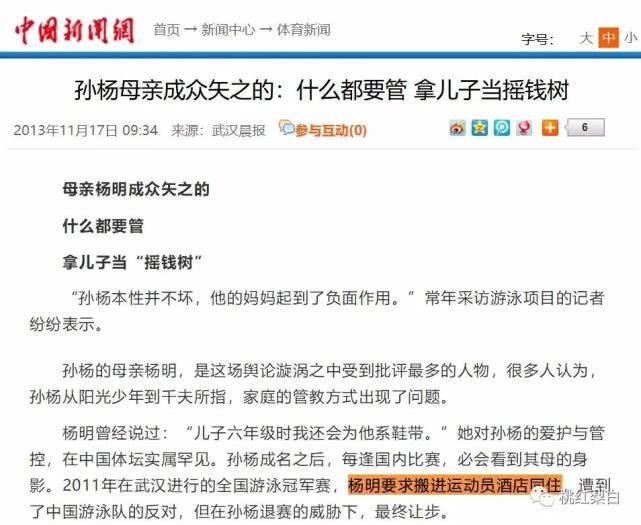 孙杨参加比赛,她要求跟儿子同住,不然就让儿子退赛。 还是2011年,孙杨参加全国游泳冠军赛,杨明要求跟孙杨住一起。 不惜以“孙杨退赛”威胁组委会,最终如愿住进游泳队指定下榻酒店。