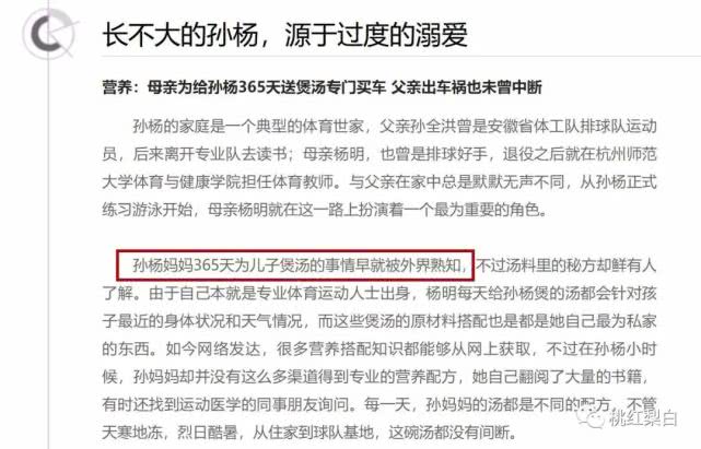 孙杨六年级时,杨明还会为他系鞋带。 开始游泳训练后,杨明坚持给儿子煲汤,从鸡汤、鱼汤到骨头汤……365天不断。