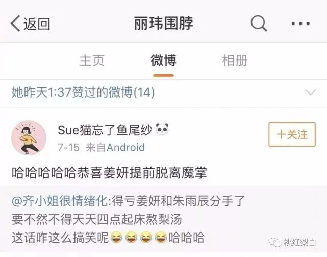 姜妍选择跟朱雨辰分手之后,姜妍妈妈点赞了一条“恭喜姜妍脱离魔掌”的微博,大有为女儿鸣不平之意。