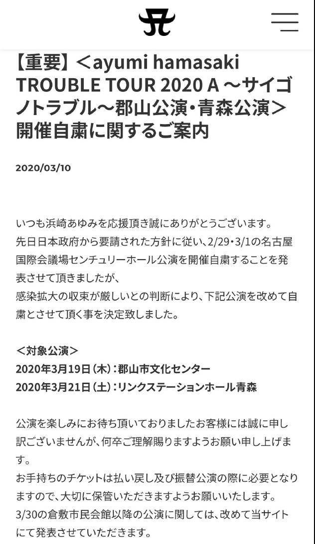 3月10日,滨崎步方发布关于滨崎步 <ayumi hamasaki TROUBLE TOUR 2020 A ~サイゴノトラブル~ 郡山公演・青森公演>的提前中止通知,通知中表示根据感染扩大的严峻形势,原定于3月19日举办的郡山公演和3月21日举办的青森公演将提前中止。