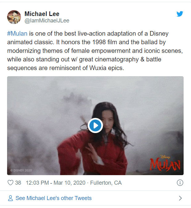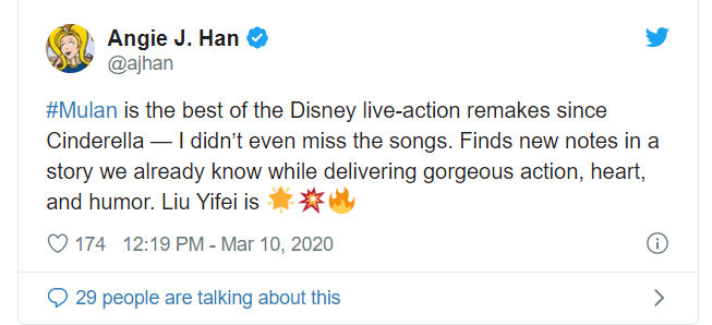 @Angie J.Han:《花木兰》是继《灰姑娘》之后最棒的迪士尼真人电影,我甚至连片尾曲都不想错过。从这个我们耳熟能详的故事中,可以找到新的注解,同时它带来了极佳的动作戏、内心戏和幽默感。刘亦菲超棒!