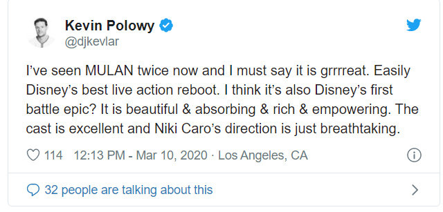 @Kevin Polowy:我至今已经看过两遍《花木兰》了,必须说它太棒了!它是迪士尼最好的真人电影。我认为这或许也是迪士尼的第一部战争史诗片?它美观、引人入胜、丰富、充满能量。演员非常优秀,并且妮基卡罗的执导也叹为观止。