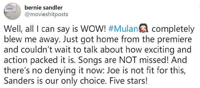 @bernie sandler:我只想说哇哦!《花木兰》完全征服了我。参加完首映回到家,我已经迫不及待地分享这部影片有多么激动人心和内容丰富。歌曲绝对不能错过!现在不可否认的是:Joe不太适合,Sanders是我们仅有的选择。五星!