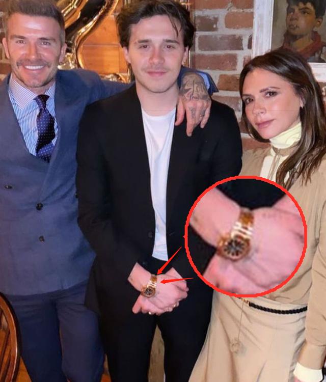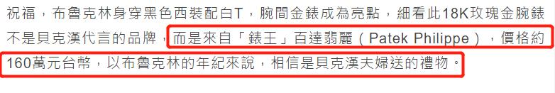 不过照片中最抢眼的还要算布鲁克林手腕上戴着的那一块金表,据悉此18k玫瑰金腕表并不是贝克汉姆所代言的品牌,而是来自有“表王”之称的百达翡丽,价值约160万元台币(约37万元人民币),以布鲁克林的年龄来说,这应该是贝克汉姆夫妇送的生日礼物吧!
