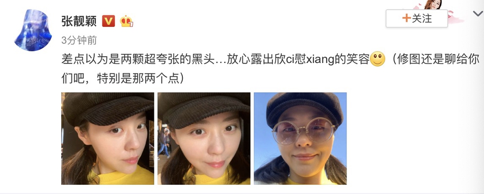 3月9日,张靓颖晒出近照,并配文:“差点以为是两颗超夸张的黑头…放心露出欣ci慰xiang的笑容(修图还是留给你们吧,特别是那两个点)