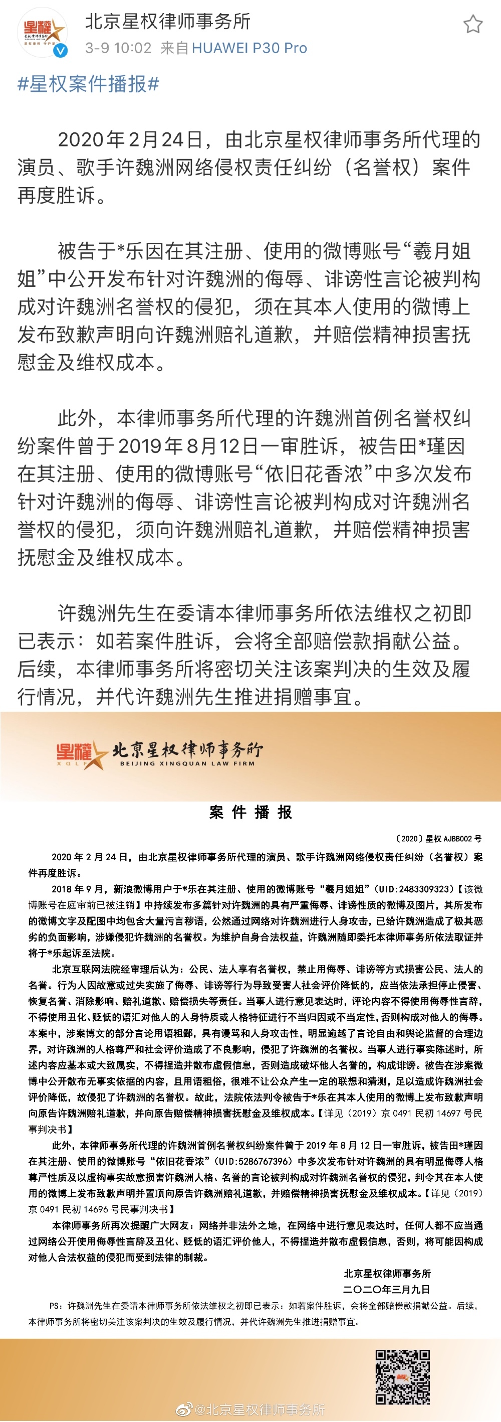 3月9日,北京星权律师事务所发布案件播报,宣布演员、歌手许魏洲网络侵权责任纠纷(名誉权)案件再度胜诉。2018年9月,许魏洲方就于*乐因其所发布的微博文字及配图中均包含大量污言秽语,给许魏洲的人格尊严和社会评价造成了极其恶劣的不良负面影响,涉嫌侵犯许魏洲的名誉权。被告者须在其本人使用的微博上发布致歉声明向原告许魏洲赔礼道歉,并向原告许魏洲赔偿精神损害抚慰金及维权成本。