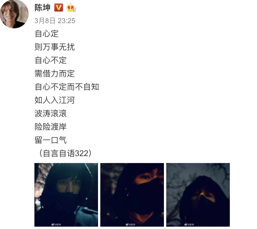 3月8日晚,陈坤晒出自拍照,并配文:自心定,则万事无扰。自心不定,需借力而定。自心不定而不自知,如人入江河,波涛滚滚,险险渡岸,留一口气(自言自语322