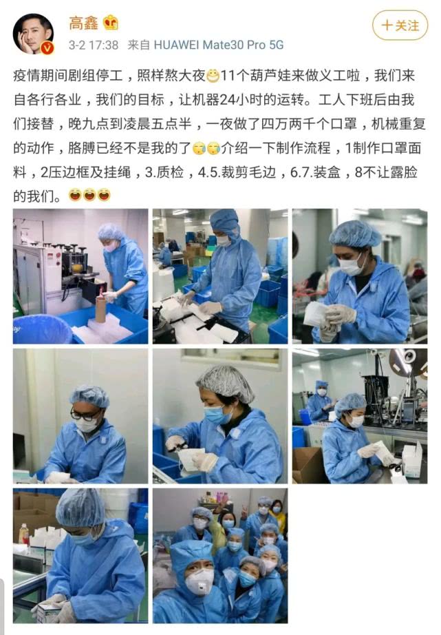 疫情期间,剧组停工了。疫情之下口罩是最紧缺的物资。于是,戴着口罩手套、穿着防护服,被高鑫趣称为“11个葫芦娃”的他们,便自发去口罩生产线做了义工。