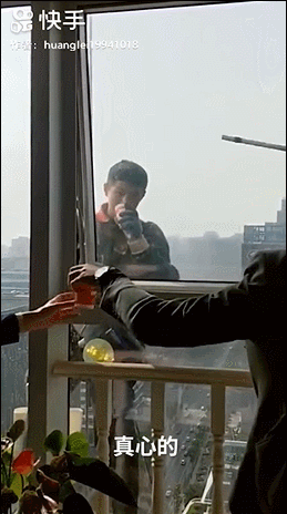 公司职员给在高楼外面清洗玻璃的工人送水。
