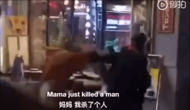 而歌词“Mama ,(i)just killed a man”对应的画面是齐天大圣和猪八戒打扮的两个人正在殴打别人。